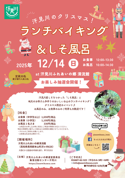 - 【12/14(日)】汗見川クリスマスランチバイキング&しそ風呂イベント、参加者募集!