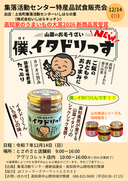 - 【12/7(日)帯屋町・金高堂前】集落活動センター美良布(香美市)の特産品を販売!