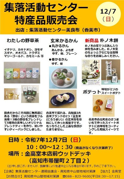 - 【12/7(日)帯屋町・金高堂前】集落活動センター美良布(香美市)の特産品を販売!