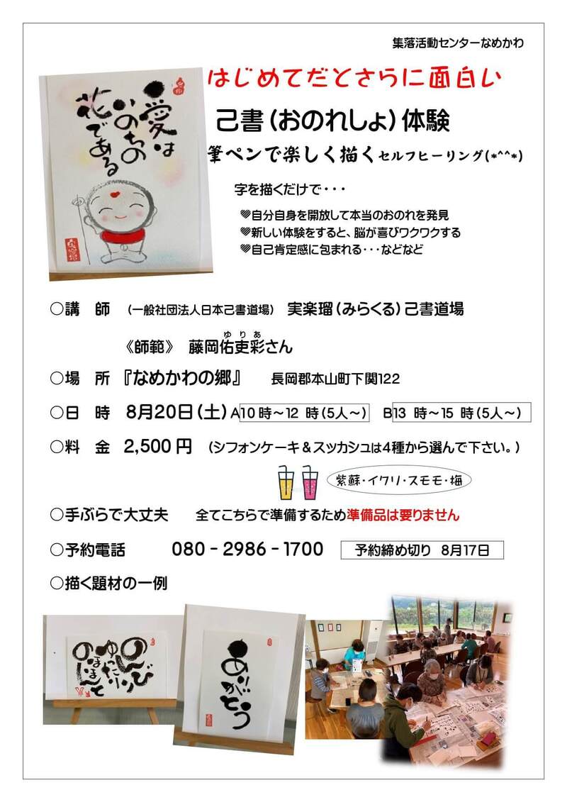 HOME > 【参加者募集中】8/20(土)己書(おのれしょ)体験(本山町)