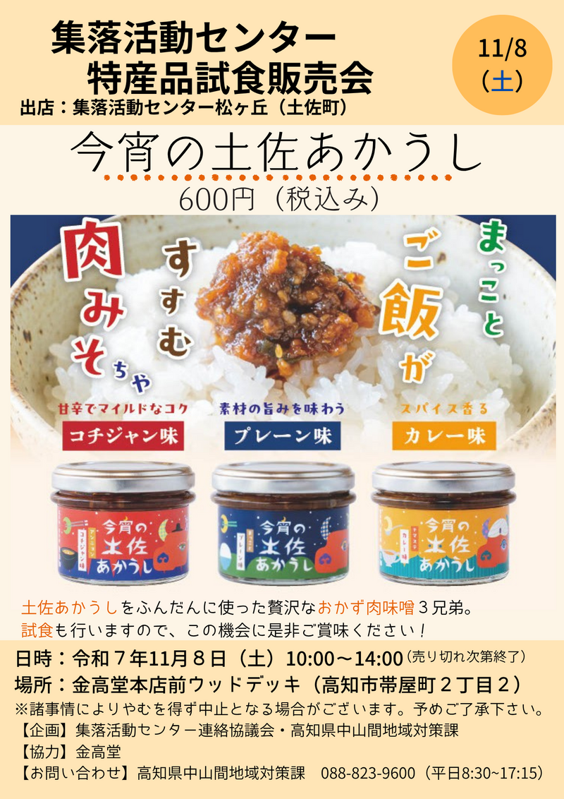 【11/8(土)金高堂本店前】集落活動センター松ヶ丘(土佐町)が特産品を販売します!