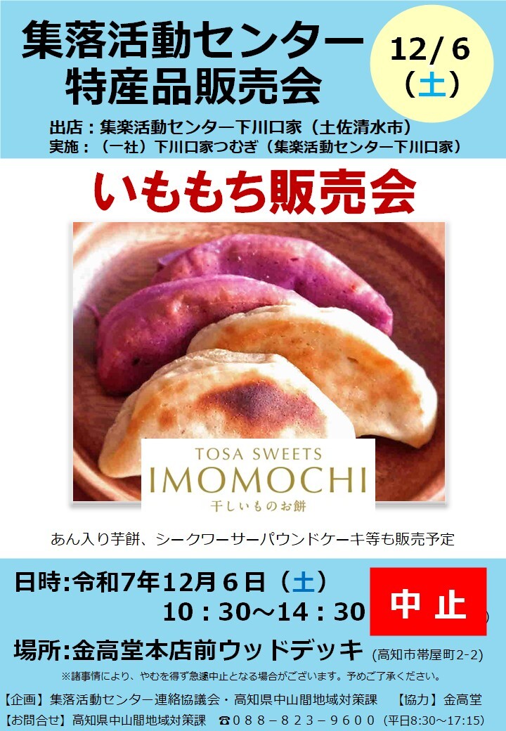 令和7年12月6日(土)に予定していた、集楽活動センター「下川口家(土佐清水市)」の特産品販売会は、
